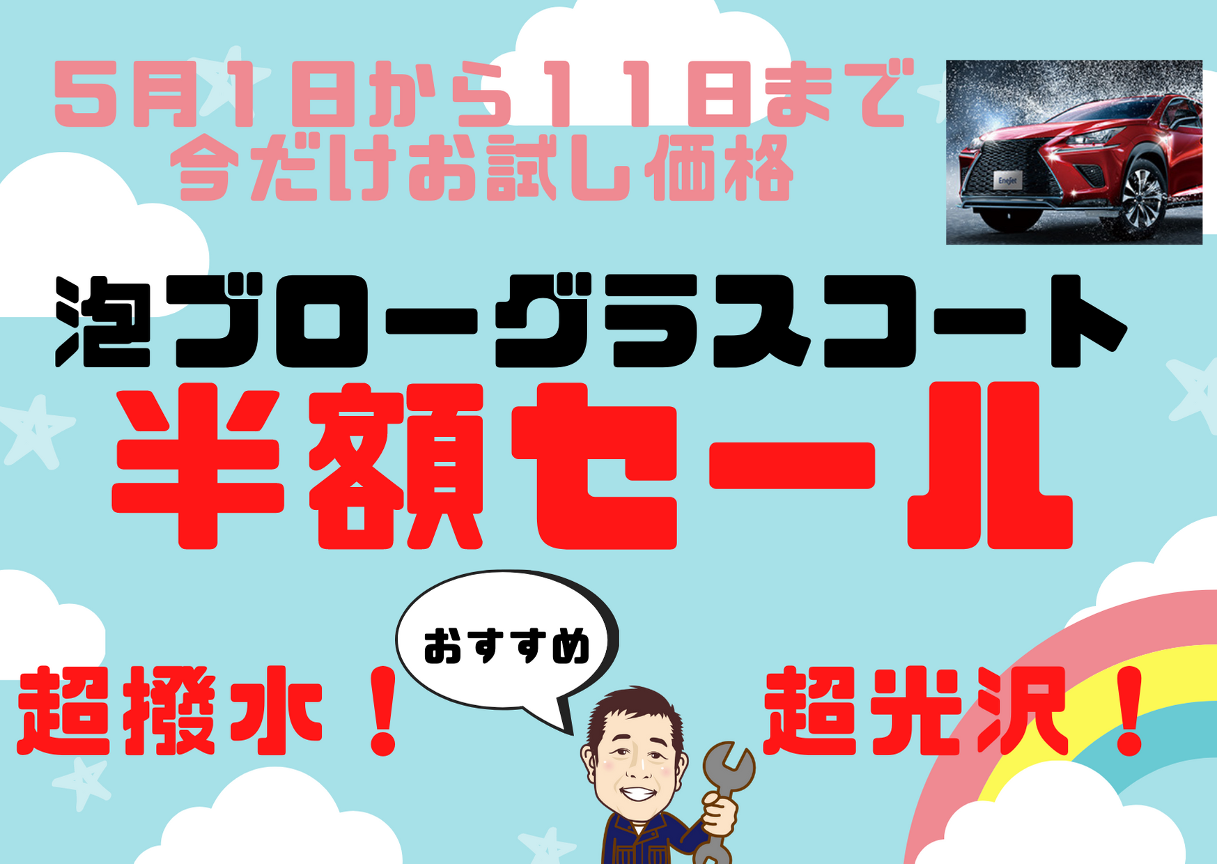 大好評の泡ブローグラスコート半額セールを、5月1日(土)から5月11日(火)まで実施します。